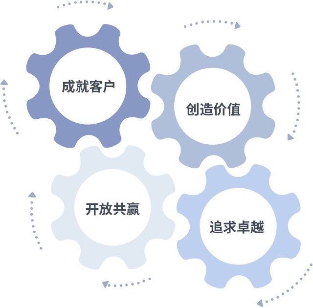 成就客户是一切决策的出发点,,,创造价值是衡量所有工作的标准,,,,追求卓越是我们做事做人的态度,,开放共赢是我们的格局也是最终的结果。。。价值观的齿轮环环相扣,,,,推动着组织里的每个人不断向前。。。