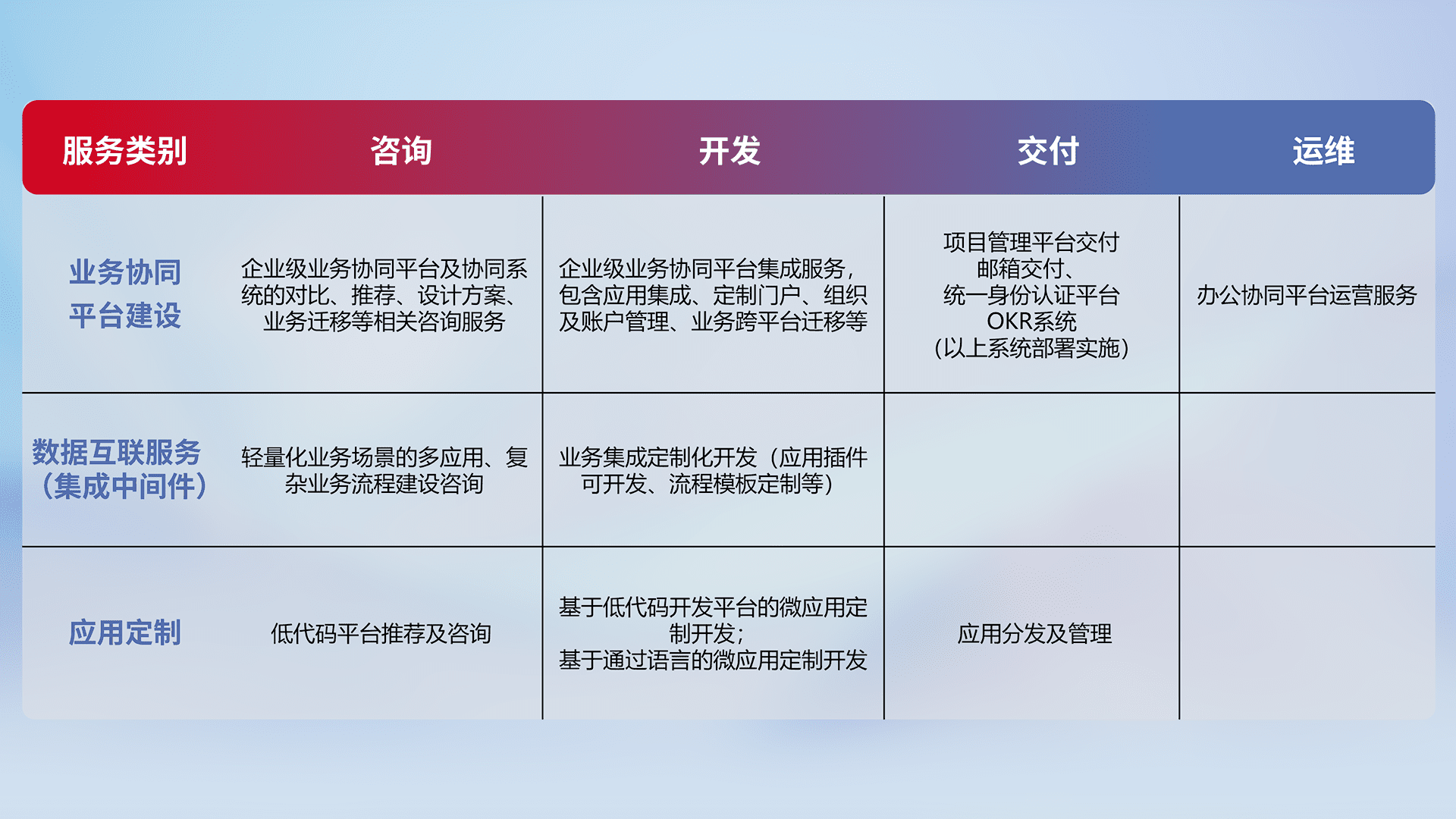 针对钉钉、、、、企微、、、、IDaas等平台级产品提供产品的规划、、、方案、、交付、、、、定制化开发等服务,,,实现如统一协同办公、、、、智能客户服务、、混合会议管理、、智能数据查询、、、、等业务场景,,,,实现数字化转型。。。