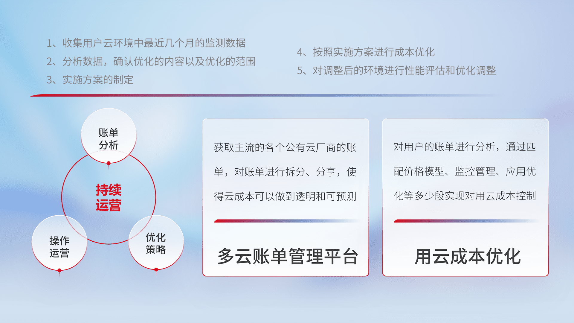 通过多云纳管,,以统一的资源数据模型把客户的云资源进行抽象和封装,,,进而实现对多云资源的统一操作,,保障云资源管理的可靠性、、、稳定性与可用性。。。量身定制化运维内容,,,配置、、开发运维、、、补丁管理、、备份、、、监控、、、、认证和访问管理、、审计和日常巡检等,,保障在用云过程中的可靠度,,,,稳定度以及高可用率。。
